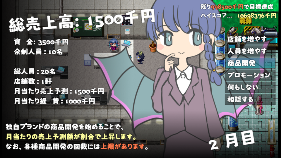 経営シミュレーションです。店舗を増やしたり、人を増やしたり、商品を開発したりを30回やって最終的にいくら稼いだかを競います。借金もできますが資金マイナスがしばらく続くとゲームオーバーです。
