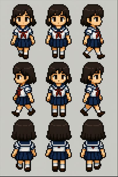 ウディタ用の48*64で4方向のセーラー服の女の子の歩行キャラチップ作って