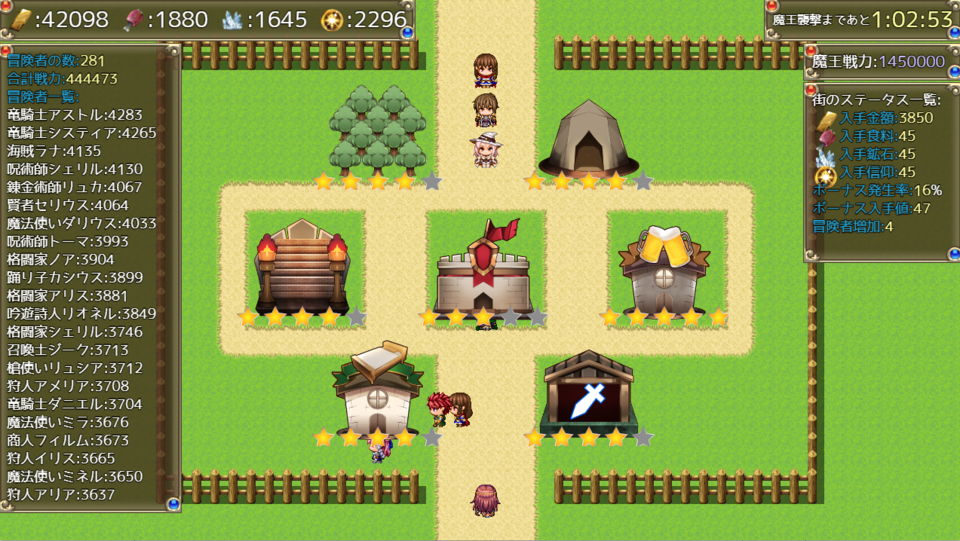 お城が発展すると勇者も街にやってきます。5分経過後に魔王を倒せるぐらい勇者が集まっていたらクリアです。