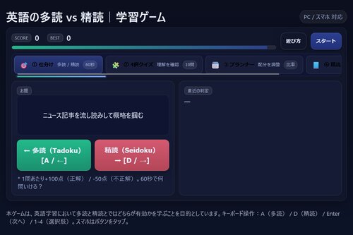 まず『多読』と『精読』の意味は知っておいた方がいいです。『多読と精読どっちがいいの?』がメインですが、多読と精読の説明がゲーム内にないです。ネットで調べてください。