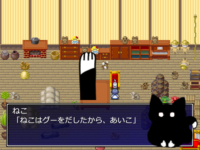 じゃんけんミニゲームです。ネコとじゃんけんします。ネコの手は多分ランダムです。部屋の探索もできます。脅かし要素がちょっとあります。なんかやったらクリアです。あとはネタバレしか書くことないです。恐れずに書きます。